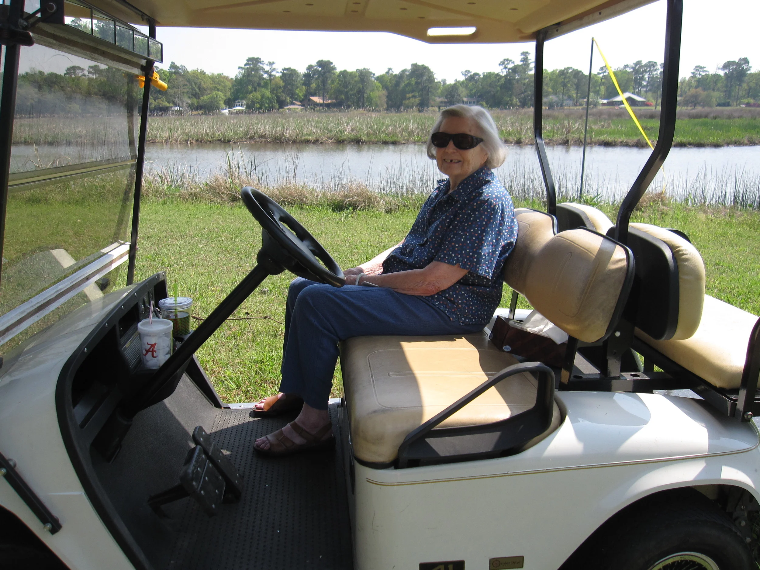 The ride was most pleasant as we drove to our friend’s house on the river. We are able to ride up the river’s edge and enjoy the cool breeze from the water, and alternately ride along the single lane road surrounded by rich wet woods, evoking a feeling of riding along a back road in the foothills of Georgia or North Carolina. We drove from one end of our neighborhood to the other and around the block. As we approached our driveway to turn in, I asked her if she were ready to turn in. “No,“she replied. I took that to mean that she had enjoyed the ride. We ended the ride anyway, and after getting her back into the house, I returned the cart.